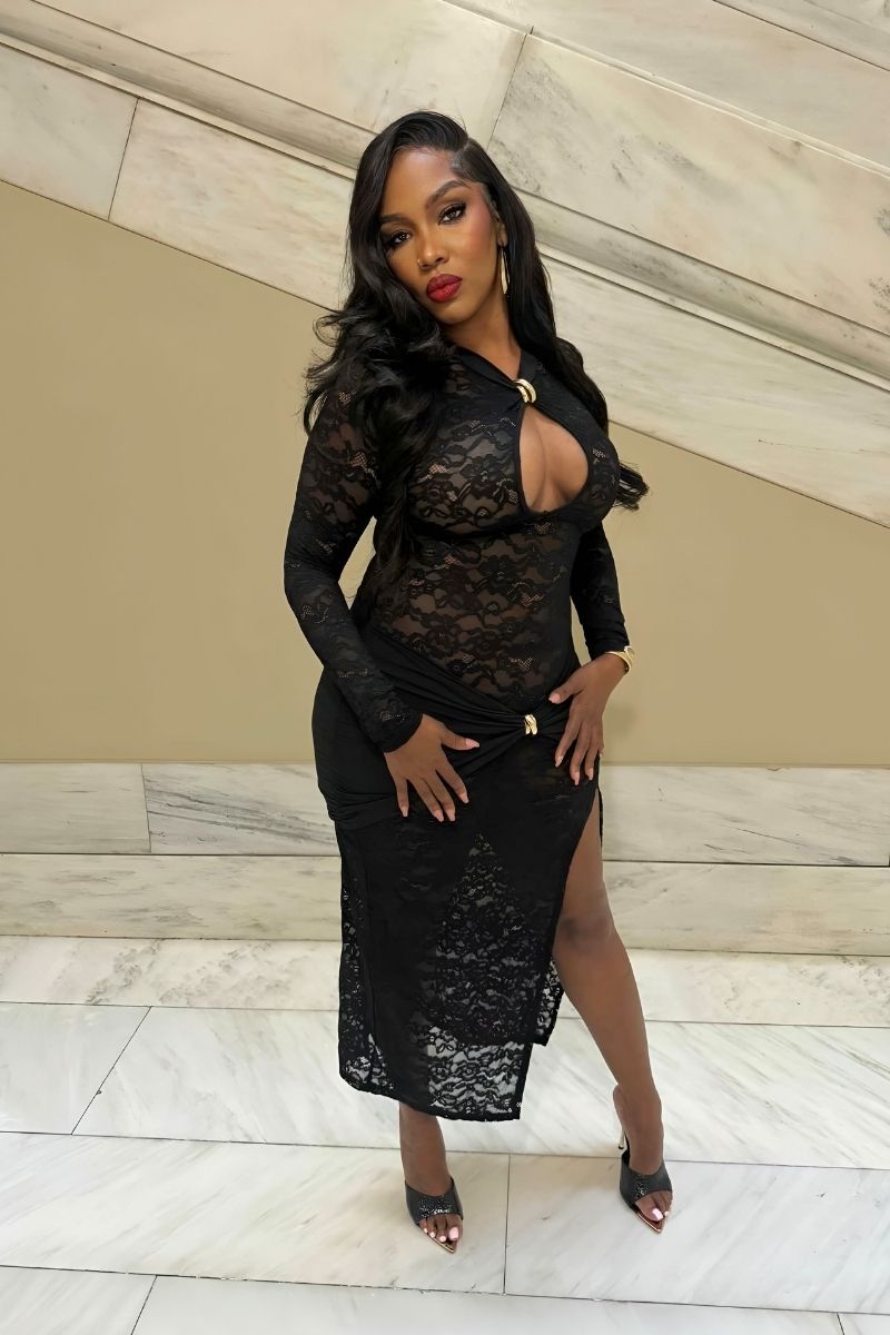 Unveil your inner goddess with the Dark Romance Maxi — a daring fusion of elegance and allure. Crafted from delicate black lace, this long-sleeve maxi dress features a sultry keyhole cutout, gold-tone accents, and a figure-sculpting ruched waistline. The high side slit teases with just the right amount of drama, while the sheer lace adds an irresistible edge. Perfect for nights when you want to command every glance in the room.