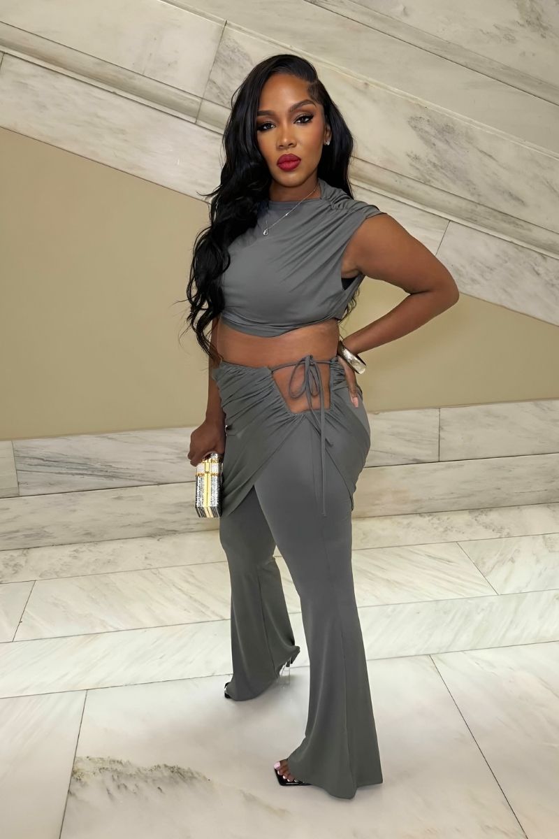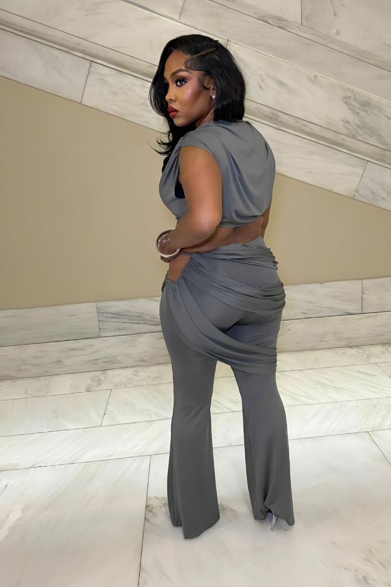 Step into sleek sophistication with the Grey Mirage Set. Designed in a luxe slate grey, this set pairs a draped high-neck crop top with figure-hugging ruched pants. The adjustable side-tie detail cinches the waist while wide-leg bottoms add a touch of drama, elongating your silhouette with every step.