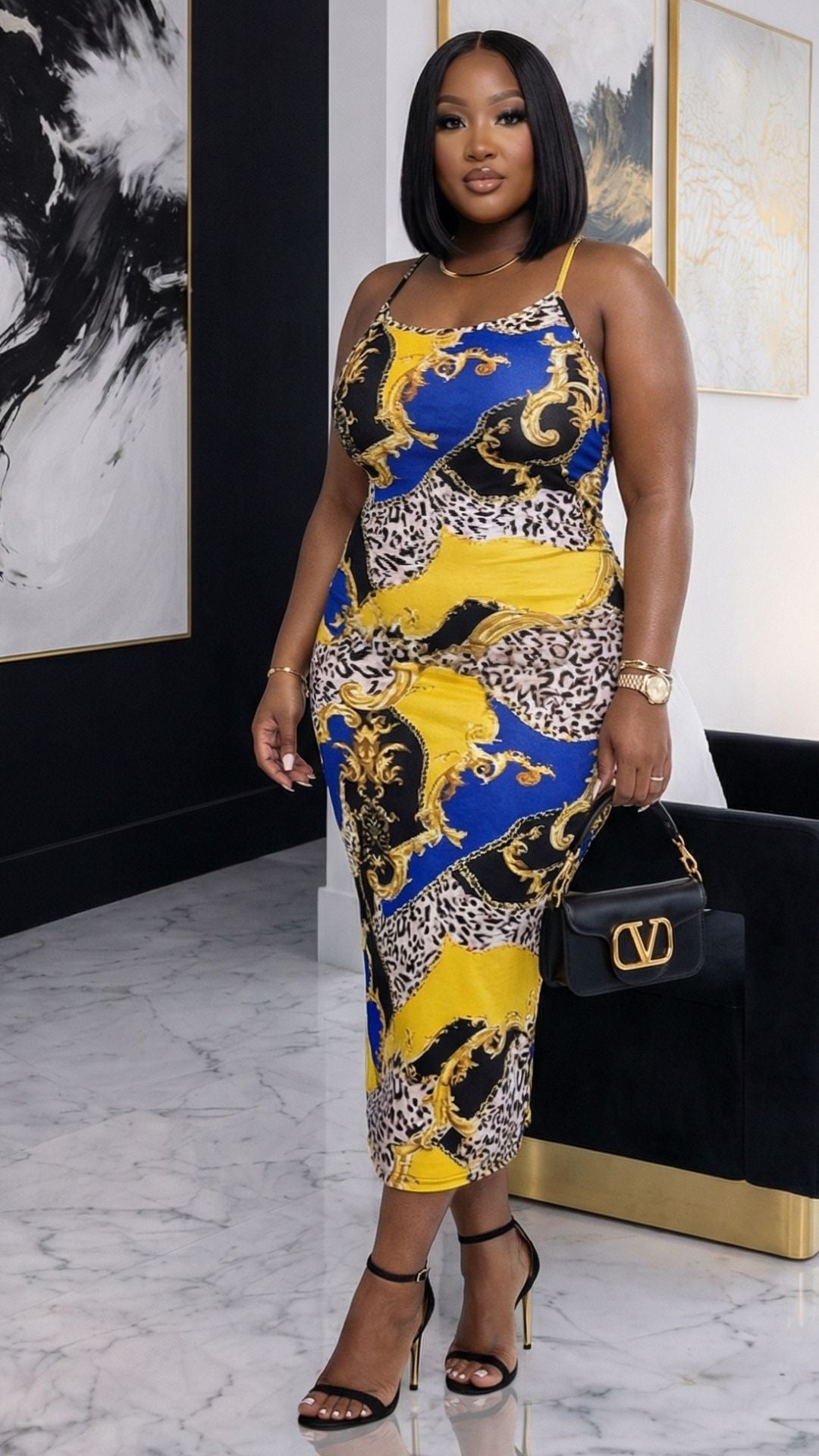 Make a stunning statement in the Royal Bodycon Dress, featuring delicate spaghetti straps and a flattering round neckline. The stylish X-back design adds an alluring touch, while the stretch material ensures a comfortable, figure-hugging fit that moves with you. Perfect for turning heads at any occasion.