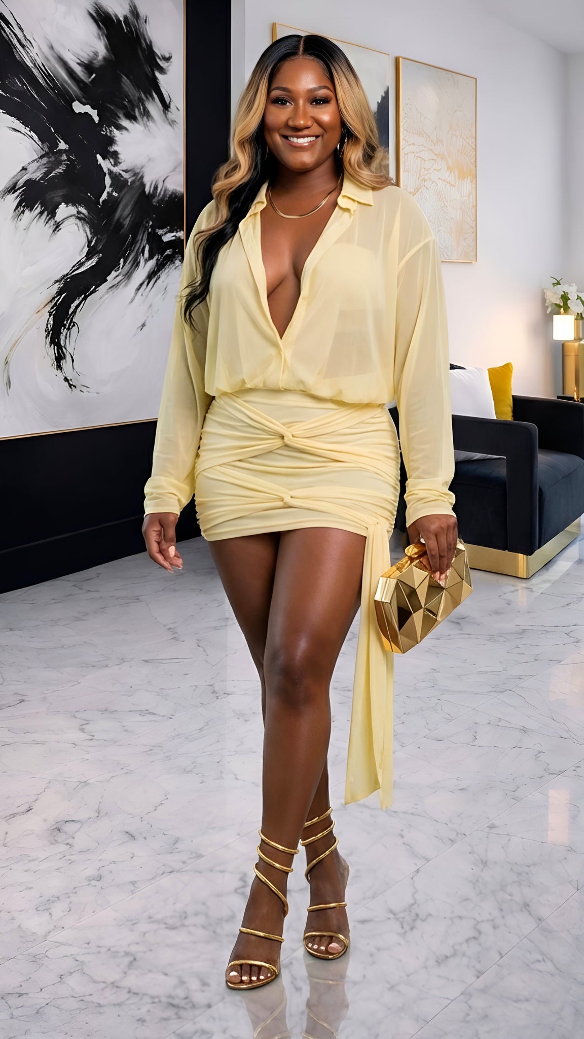 Make an unforgettable entrance in the Golden Glow Sheer Wrap Dress. This bold yet sophisticated piece is crafted from a lightweight, semi-sheer fabric that gives just the right hint of allure while keeping it chic. Designed with a classic button-up shirt top, it flows into a curve-hugging mini skirt with a dramatic wrap-around tie belt that cinches the waist perfectly. The long sleeves with cuff detail add a polished finish, while the soft golden hue radiates elegance